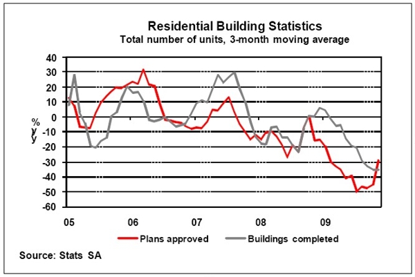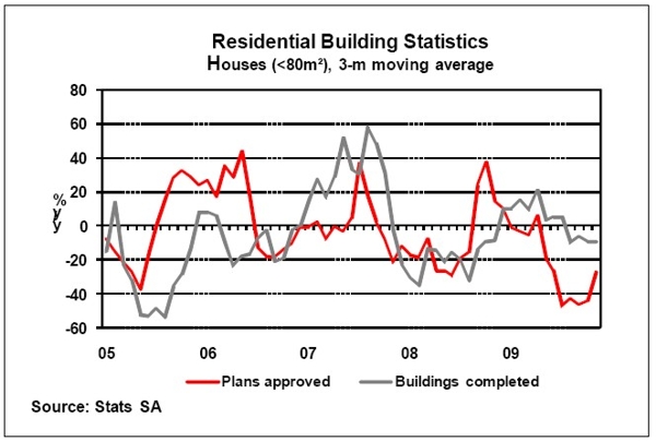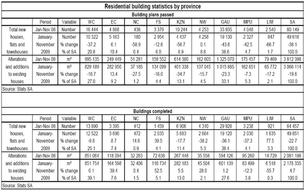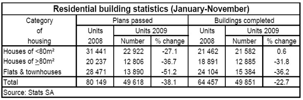 Activity with regard to new housing construction contracted at slower pace towards late 2009 compared with a year ago, but the sector continued to experience a fair amount of pressure. In terms of the volume of building plans approved for new housing, conditions deteriorated at a markedly slower pace, while the declining trend in new housing constructed appears to be at a lower turning point. The real value of building plans approved for new housing came to R16,31 billion in the first eleven months of 2009, which was 39,3% lower than the R26,88 billion recorded in the same period the preceding year. The real value in respect of new housing constructed was down by 26,5% year-on-year (y/y) to R16,77 billion in January to November last year (R22,80 billion in the corresponding period of 2008). All real values are calculated at constant 2005 prices. The total number of building plans approved for new housing was markedly down in all three segments in January to November 2009 compared with a year ago (see table below). The total number of plans approved for new housing was down by 19,9% y/y to 3 836 units in November last year (-28,3% y/y in October). The total number of new housing units completed declined by 22,7% y/y in the first eleven months of 2009, continued to be driven by the segments for houses larger than 80 m² and flats and townhouses. In November last year the number of new housing units completed was, at 3 997 units, 32,2% y/y lower than in November 2008 (-36% y/y in October last year). The number of lower-cost housing units constructed was almost unchanged in January to November from a year ago, with trends in the planning phase still indicating that the construction phase might be negatively affected in the short to medium term. Residential building activity remains extremely low compared with historical trends, despite some indications that the sector might be contacting at a slower pace. Significantly higher levels of activity on an annual basis are still not expected over the short term, taking account of prevailing housing demand and supply conditions.