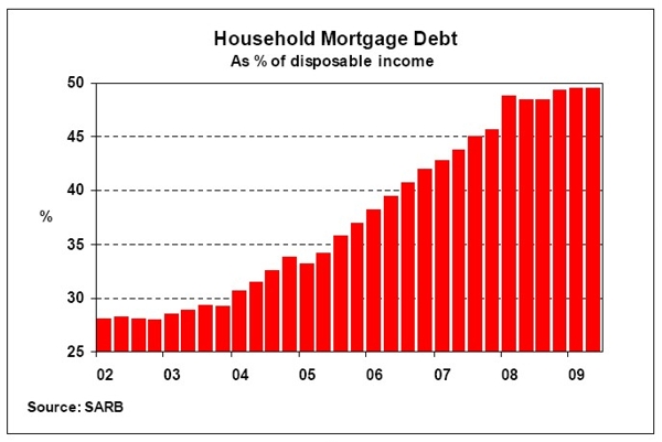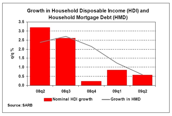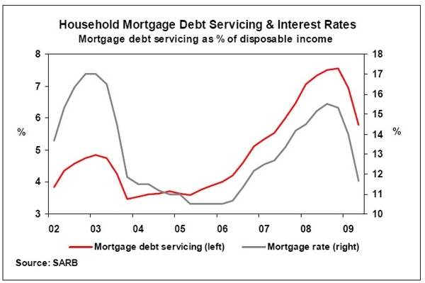 Interest rates have been cut by 500 basis points since late 2008, with prime and mortgage interest rates back to their mid-2006 levels of 10,5%, which resulted in lower debt repayments. Despite lower interest rates, the household sector continued to experience financial strain. Households still have to deal with a relatively high ratio of debt to disposable income (76,3% in the second quarter of 2009), mainly as a result of low growth in their nominal income on the back of deteriorating business conditions and major job losses in most sectors of the economy in the first six months of the year.