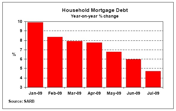 Year-on-year growth in the value of mortgage advances to households slowed down to 4,7% in July 2009 from 6% in June, while on a month-on-month basis, very little growth was recorded since April this year. This is a reflection of conditions experienced in the housing market over the past few months, which affected the demand for mortgage finance. Growth in mortgage advances to households is expected to slow down further towards the end of 2009.