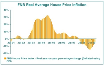 After an average decline of -3.9% for 2009 as a whole, the FNB House Price Index heads for 2010 on a rising trend. The FNB House Price Index average for 2009 showed a decline of -3.9% compared with the average value for the previous year. This was significantly worse than the +6.9% inflation of 2008, and a far cry from the +29.5% average price inflation registered in 2004, which proved to be the best year of last decade. However, while pointing to a dismal 2009 as a whole, on a monthly basis the index pointed to steadily improving times as the year drew to a close. December 2009 saw the 2nd consecutive month of year-on-year (December 2009 price level compared to December 2008) price inflation to the tune of +2.7%, an improvement on November’s revised inflation figure of +1.4%.