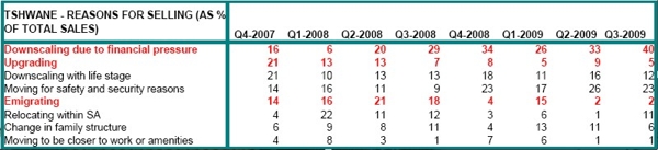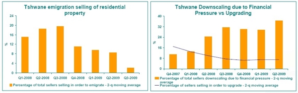 Selling in order to downscale due to financial pressure remained extremely high in importance, at 40% of total selling, according to agents surveyed. Seen on a 2 quarter moving average basis, the percentage was still extreme at 37%. There seems little doubt that many of the Tshwane Metro’s residents still experience significant financial pressure. Simultaneously, selling in order to upgrade remained very low at 5% of total selling. Therefore, despite improving demand for property, it is plausible to believe that something of an oversupply probably still exists as a result of ongoing financial pressure, relieved in part by interest rate cuts but not helped by a severe recession. As a percentage of total selling, emigration selling in Tshwane showed a massive surge during 2008, similar to the trend in other metros. After a peak of 21% in the 2nd quarter of 2008, there has been a broad decline in emigration selling’s significance to only 2% of total selling by the 3rd quarter of this year, according to the estate agents surveyed.