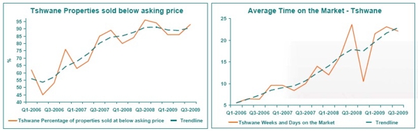 Interpretation/Conclusion__ Although not expected to be a strong recovery, the 3rd quarter Barometer points to significantly stronger demand situation in the Tshwane Metro residential market compared to a very low activity rating last year. This metro may well be one of the more stable ones economically because of a large government component, and government employment and remuneration is generally very stable. However, the city was not spared the recent recession, while the high rate of economic growth in the area prior to the recent downturn was accompanied by what appeared to be a very high level of building activity. The net result has been an oversupply of residential stock in recent times it would appear. The 3rd quarter jump in demand was significant, although other key indicators such as average time on the market and percentage of sellers achieving their asking price haven’t shown any meaningful improvement yet. Deeds data runs a bit behind, and still shows widespread price deflation as at the 2nd quarter, but this is expected to change slowly for the better in the numbers for the 2nd half of 2009, tracking the national trend back towards price inflation. To date, the demand improvement is largely the result of interest rate cuts, and banks’ responses to better market conditions by relaxing lending criteria has reinforced the trend. In the near term, though, the economy is expected to provide more support for the market as we emerge from recession.