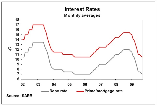 After a cut of 50 basis points in August, the South African Reserve Bank’s Monetary Policy Committee left the key monetary policy interest rate – the repo rate – unchanged at 7% at their September meeting. As a result, commercial banks’ lending rates to the public, i.e. prime and mortgage rates, also remain unchanged, at a level of 10,5%. Interest rates have been cut by a cumulative 500 basis points since December 2008. Mortgage repayments are 26,3% lower compared with late last year, based on the interest rate cuts since December, when the mortgage rate was at a level of 15,5%. However, the household sector remains heavily indebted, with the ratio of household debt to disposable income at 76,3% in the second quarter of 2009. Outstanding household mortgage debt was just below 50% of disposable income in the second quarter. The cost of servicing household debt as a percentage of disposable income was lower at 9,2% in the second quarter, while that of household mortgage debt tapered off to 5,8% in the same period. This was mainly the result of lower interest rates. CPI inflation for all urban areas was lower at 6,4% year-on-year (y/y) in August 2009 (6,7% y/y in July), and may moderate somewhat further in the near term. Producer prices are deflating since May this year, with price deflation at a level of 3,8% y/y in July. According to Absa’s calculations, year-on-year house price deflation slowed down since July. In nominal terms, house prices declined by 3,4% y/y in August 2009, after declining by 3,7% y/y in July and 3,8% y/y in June In real terms, prices dropped by 9,2% y/y in August, after a decline of 9,7% y/y was recorded in July. On a month-on-month basis, house price deflation started to taper off since April, with price inflation recorded in July and August. These month-on-month trends contributed to slower year-on-year price deflation in the past two months. Nominal year-on-year house price deflation is expected to continue to slow down towards the end of 2009, with price inflation forecast from early next year. House prices are forecast to decline by around 3% in nominal terms this year, with prices projected to decline by almost 10% in real terms. In 2010, nominal house price growth of just below 3% is expected. Prices are set to drop further in real terms next year, taking into account projections for nominal house price growth and inflation.
