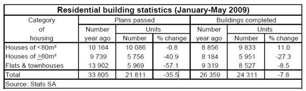 Data on residential building activity released by Statistics South Africa up to May 2009 indicate that activity in the planning and construction phases of new housing slowed down further on the back of an economy that is in recession. In the period January-May this year residential building plans with a total real value of R7,09 billion were approved by local government institutions, which was 47,3% lower compared with R13,44 billion in the same period last year. The real value of residential buildings reported as completed in the first five months of 2009 was 16,7% lower at R7,67 billion compared with R9,21 billion in the period January-May 2008. All real values are calculated at constant 2005 prices. In all three segments of housing the number of residential building plans approved was down in January-May this year (see table below). In the segments of houses larger than 80 m² and higher-density housing such as flats and townhouses, major declines were recorded in the number of plans approved on a year-on-year basis in the first five months of the year. The number of new housing units for which plans were approved was down by 28,4% y/y to 4 188 units in May 2009 compared with a total 5 852 units in May 2008. On the construction side, the total number of new housing units completed was down by almost 8% y/y in January-May 2009, mainly driven by the segment for houses larger than 80 m². In May the volume of units constructed was down by 17,9% y/y to 3 900, from 4 751 units in May last year and 5 359 units in April this year. The total number of square metres in respect of plans approved for alterations and additions to existing houses was down by 23,5% y/y in January-May this year. However, the total building area reported as completed with regard to alterations and additions to existing houses was up by 20,5% y/y in the same period, which was to a large extent driven by strong growth in this activity in the Western Cape, the Eastern Cape, the Free State and Mpumalanga in the first five months of the year. Based on the prevailing tough economic conditions, which impact employment, household income and levels of confidence, the expectation is for residential building activity to remain depressed in the rest of 2009. A gradual recovery in the levels of activity is only expected during the course of next year, which will depend on the demand for new housing in this period.