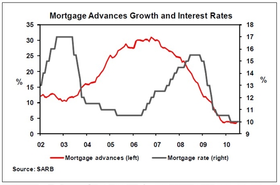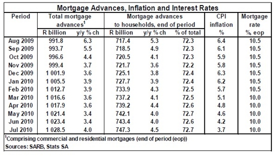 According to data released by the South African Reserve Bank, the total value of outstanding mortgage balances at monetary institutions, which includes both commercial and residential mortgage loans, increased by 4% year-on-year (y/y) to R1 028,5 billion in July 2010. Year-on-year growth of 3,4% was recorded in June. Outstanding mortgage balances were R5,1 billion, or 0,5%, higher in July compared with June. In the households sector outstanding mortgage balances were up 4,5% y/y in July (4% y/y in June) to a level of R747,3 billion. Month-on-month growth was R3,9 billion, or 0,5%, in July this year. Total credit extended to the household sector, which includes mortgage advances, increased by 4,6% y/y in July from 4,3% y/y in June. On a month-on-month basis the value of credit extended to the household sector was R6,2 billion, or 0,6%, higher in July compared with June. Recent trends with regard to a number of domestic economic indicators, such as gross domestic product (GDP), the purchasing managers index (PMI), business and consumer confidence, and the Reserve Bank’s leading business cycle indicator, point to a slowing economy. Both consumer and producer price inflation tapered off further to below market expectations in July this year, while concerns over the prospects for the global economy are growing. Against the background of these developments, the Reserve Bank’s Monetary Policy Committee (MPC) is expected to cut the repurchase (repo) rate by another 50 basis points to 6% at next week’s meeting. Commercial banks’ lending rates to the public, i.e. prime and variable mortgage rates, may also be lowered by 50 basis points, to a level of 9,5%, if the MPC cuts the repo rate as expected. Year-on-year growth in credit extension to the household sector, as well as mortgage advances, is forecast to remain in single digits up to the end of 2010.