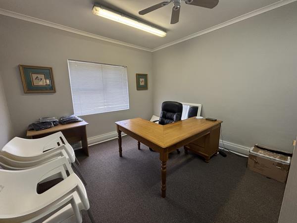 The office is thoughtfully equipped with a modern kitchenette, allowing for convenient meal prep and refreshments. Male and female ablution facilities ensure comfort and accessibility for all staff and clients. The interior design is both practical and sophisticated, featuring neat carpeting paired with elegant wooden floors and fitted blinds, creating a professional atmosphere.