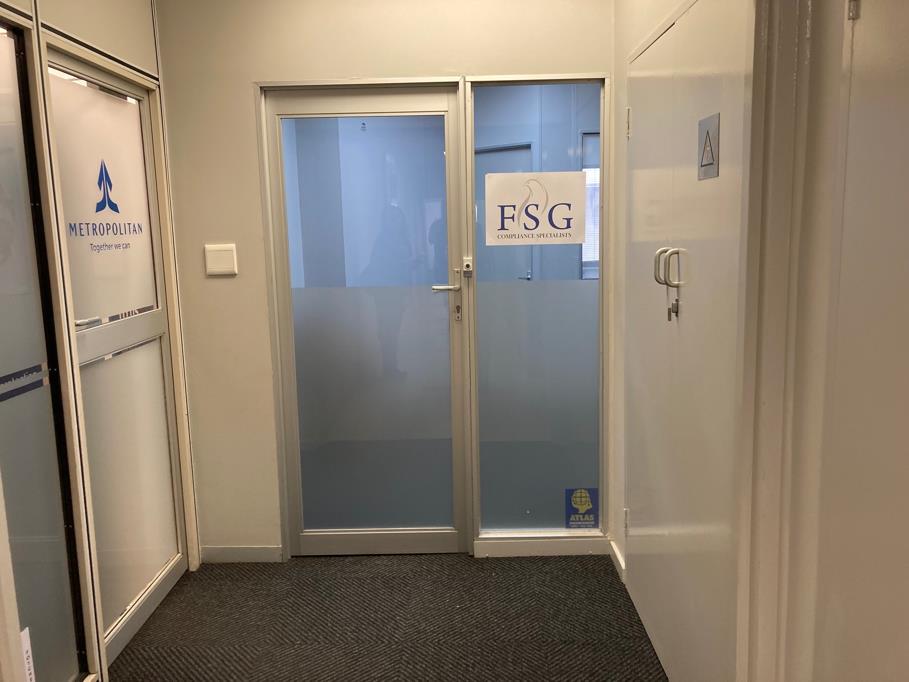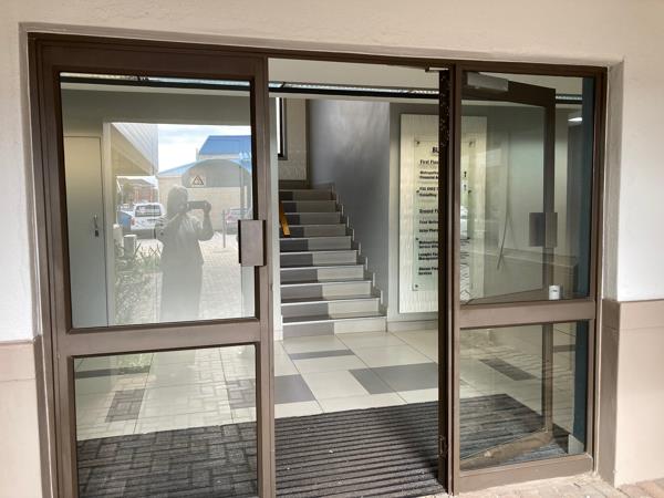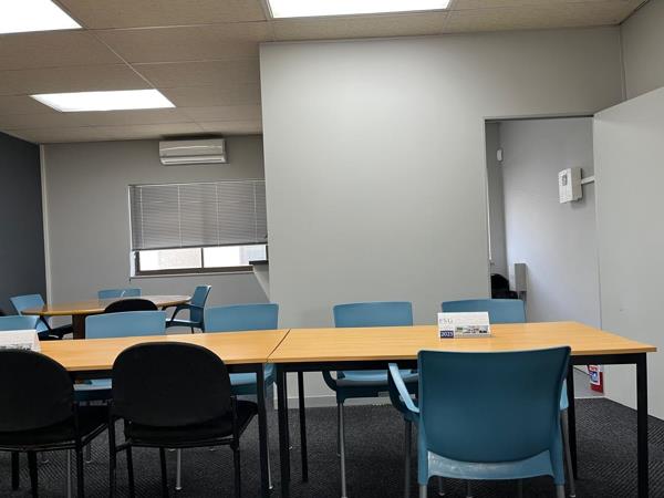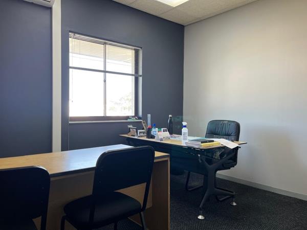 The premises feature a welcoming reception area, four private offices, a spacious training room, an open-plan office area, and a kitchenette. Male and female ablution facilities are available on the floor for shared use.