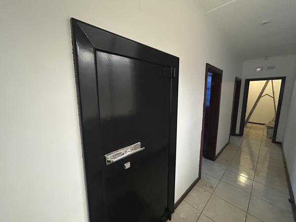 The front section includes a welcoming reception area, a spacious open-plan office ideal as a boardroom or meeting room, and three private offices. Staff amenities comprise ladies and gents ablutions and a kitchenette, ensuring a comfortable and well-equipped working environment.