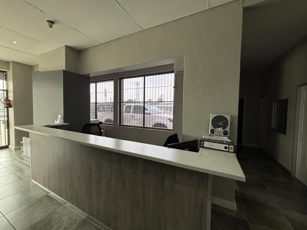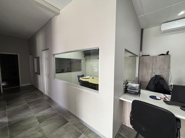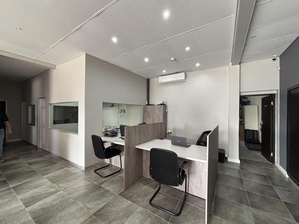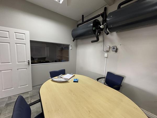 The office component measures approximately 100sqm and comprises an open-plan showroom with a reception desk, along with two private offices featuring viewing windows. In addition, there is an open desk space that has been fitted with two workstations, partitioned for privacy, creating an ideal shared or collaborative workspace. The offices are tiled, fully air-conditioned, and supported by two kitchens and ablution facilities.