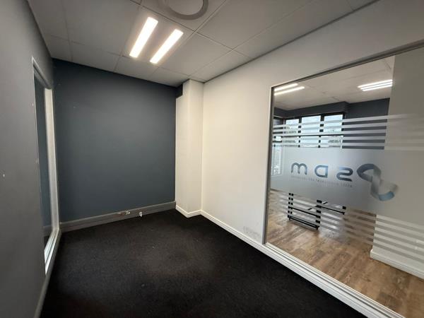 The office layout includes closed offices, an open-plan working area, and a dedicated server/storage room, offering flexibility for a variety of business operations. Shared communal spaces include a professional reception area, boardroom, kitchens, and ablution facilities, all maintained to a high standard. The interior features carpeted and laminated flooring, air-conditioning, fibre connectivity, and large windows fitted with blinds, allowing abundant natural light to illuminate the workspace.