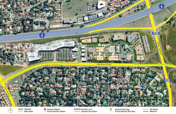 P-grade office space for Irene Link is reachable from Botha Avenue, Alexandra Street, and Impala Road, all of which are located close to the N1 highway in Doringkloof, Irene.