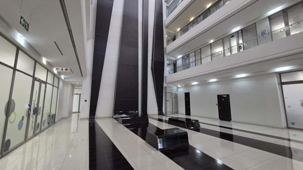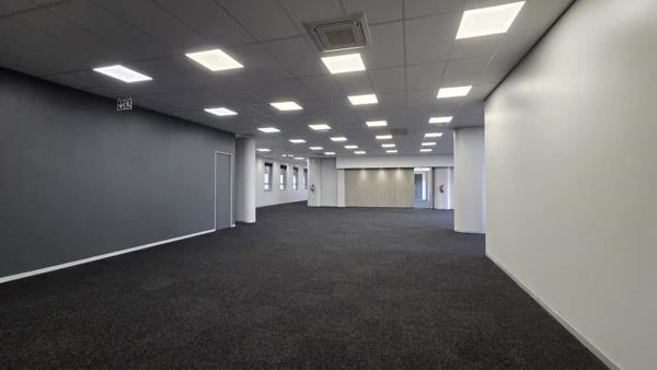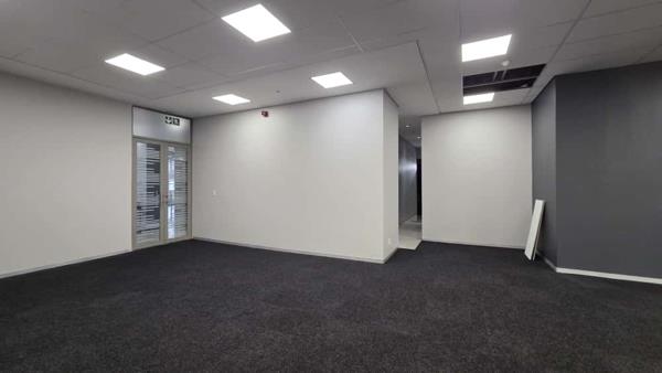 This modern office space comprises out of a reception area complete with several office areas, a boardroom, a modern kitchen area and access to shared ablution facilities. The offices feature central air conditioning, neat carpet flooring and windows that allow for ample natural light throughout the unit which creates an open-air office environment. Additionally, the office showcases up scale light fixtures and modern glass panel partitioning throughout the unit.