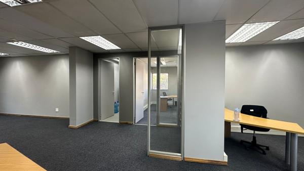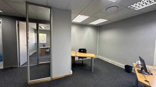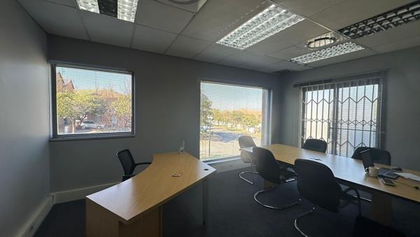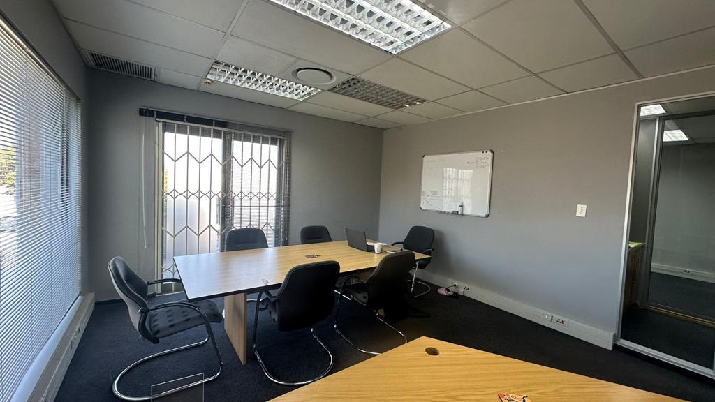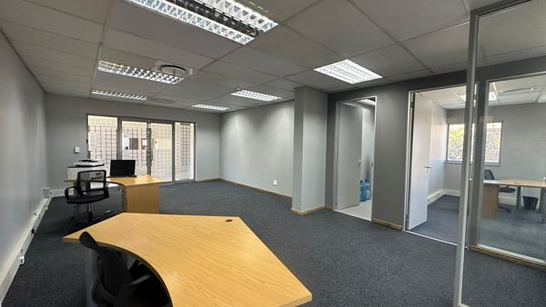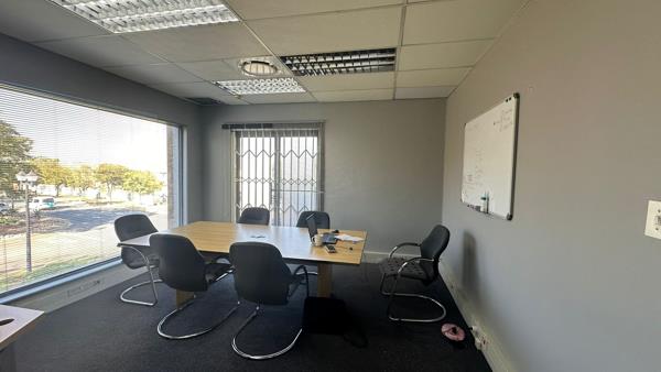 This modern office space is situated within a secure park based in the Route 21 Corporate park. This 89 square meter office unit consists of a reception area, closed offices, a boardroom, a dedicated kitchen area and communal ablutions. The offices have a spacious, patio area which in turn makes the total size 130m2 ideal for lunch breaks. It features neat carpet flooring and windows with blinds that allow for ample natural light. This office unit is equipped with air-conditioning, ready to go fibre connectivity.