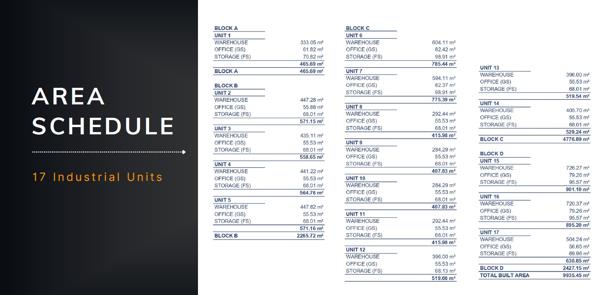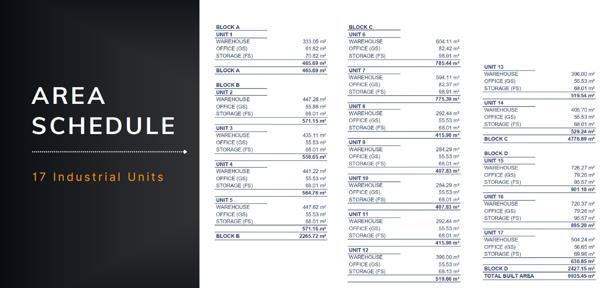 Unit Sizes: Ranging from 460sqm to 1800sqm.
