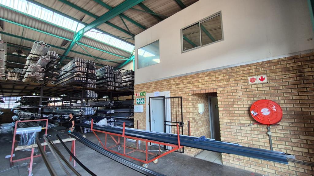 The modern office component includes a reception area, tiled offices with air-conditioning, a mezzanine level, kitchen, and neat ablution facilities. The building is fully fenced, equipped with 3-phase electricity, and fitted with firefighting equipment, ensuring safety and compliance for industrial users.