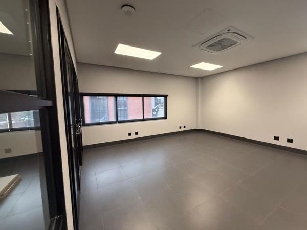 The layout offers a welcoming reception area, a spacious boardroom, and two private closed offices, providing the perfect blend of collaboration and privacy. The unit also includes a modern kitchen and well-maintained ablution facilities, ensuring comfort and convenience throughout the workday.