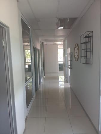 Discover an exceptional commercial rental opportunity within a secure estate in Kleinfontein, Benoni. This modern, multi-story building offers a generous floor size of 380 sqm, providing ample space for a dynamic business environment. The contemporary architectural design features clean lines, large windows, and inviting balconies, ensuring a professional first impression. The property boasts a paved driveway and parking area, surrounded by established trees, enhancing its curb appeal and offering convenience for staff and clients.