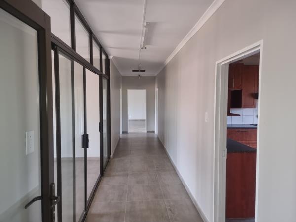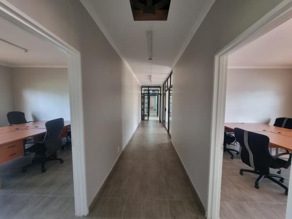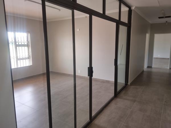The adaptable interior boasts clean, neutral-toned walls and modern tiled flooring throughout. It comprises multiple private office spaces, some with contemporary glass partitions for enhanced natural light and an open feel. Good ceiling lighting illuminates the versatile layout, ideal for diverse business operations and easy customization.