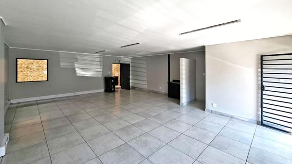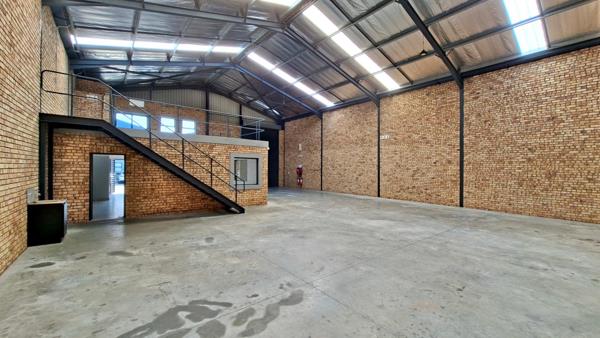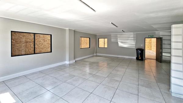 The unit includes a neat reception area and well-appointed offices, along with a mezzanine level that can serve as additional office or storage space. Staff amenities include a kitchen and ablution facilities, ensuring functionality and comfort throughout the premises.
