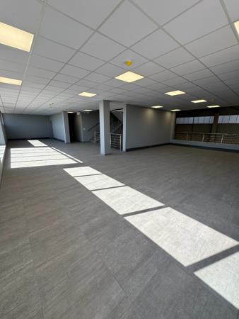 The unit offers an open-plan showroom area downstairs with ablution facilities, a modern kitchenette, a reception area and ample secure parking spaces.