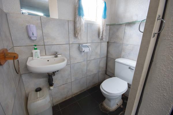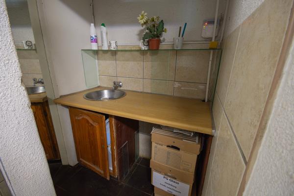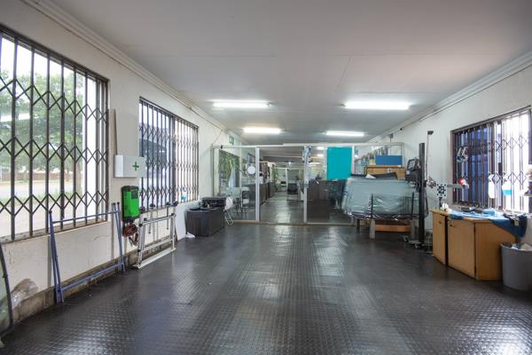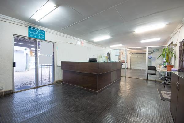 The premises include a spacious open office area alongside a dedicated showroom. Additional features comprise one private office, two restrooms, and an outdoor working space. There is also a storage room or workspace that is of garage size, which can be secured with a lock.