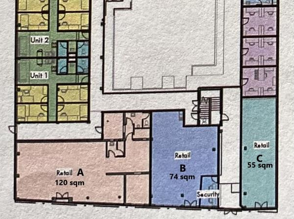 There are 3 retails portions to be leased, with the possibility of Retail Section A and B being leased by one tenant, and section C ideally lending itself to computer, printing and internet solutions. Any proposals for the space are more than welcome from you as potential tenants to the building. There is full time security in the building ensuring safety for the the students and these retail portions. The building also features solar geyser, solar electricity, and piped gas supply. One of the best benefits of this buildings includes the fact that your space as the retail tenant can be retrofitted to your exact spec, and provide you this without having to compromise on your needs and bottom line. Size of the various retail portions is as follows: