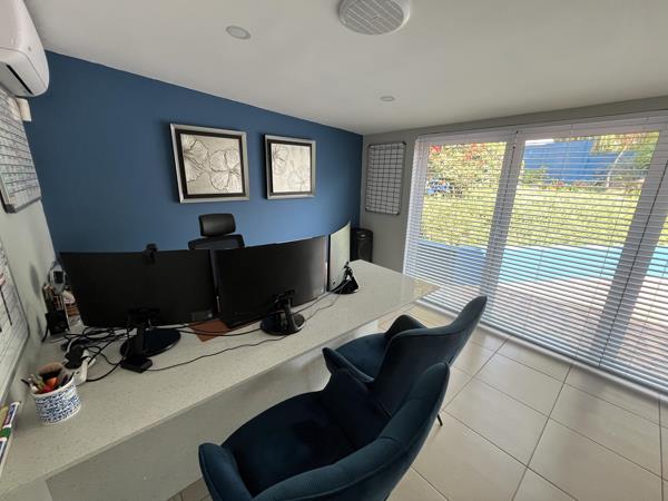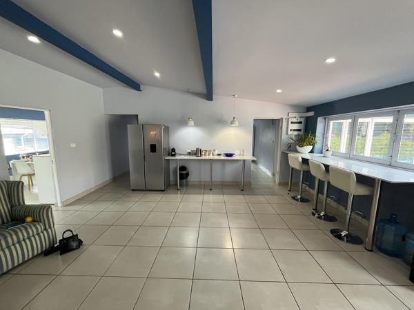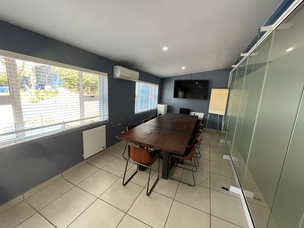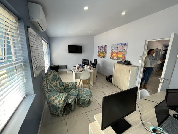 The office layout includes 4 private offices, two of which open onto the landscaped garden through staking doors, creating an ideal indoor-outdoor working environment Male and female bathrooms are provided, and the property is fully tiled for a sleek, low maintenance finish.