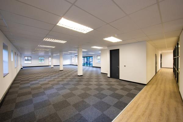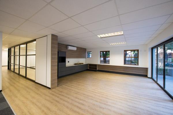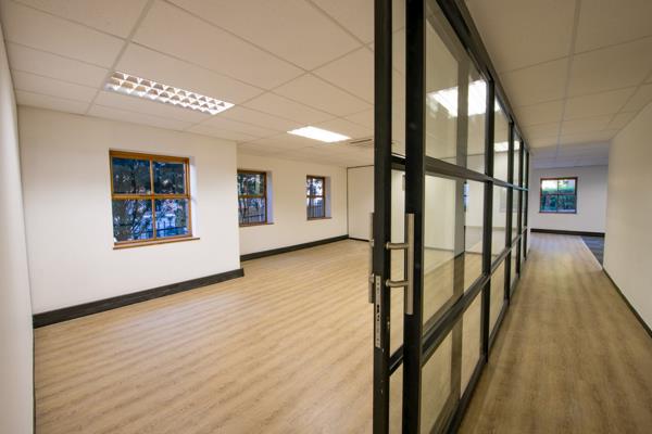 The available 383m ground-floor office suite provides a versatile mix of open-plan work areas, private offices, a reception, boardroom, kitchenette, and ablution facilities. Interiors are bright and adaptable, with most suites enjoying garden views on either side, creating a calm and productive workspace. Air-conditioning throughout, combined with solar integration and a 150kVA backup generator, ensures uninterrupted operations.