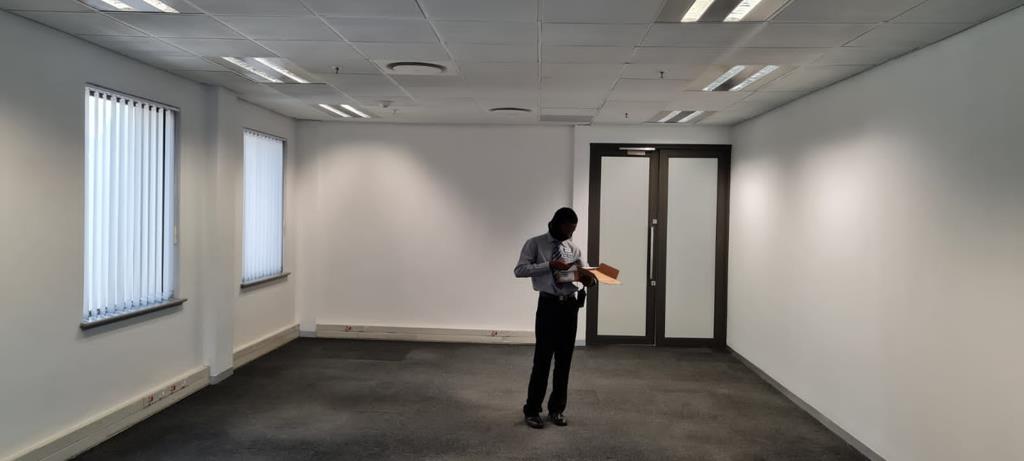 This 181,99 m2 office space is located within an access-controlled commercial building offering upmarket finishes throughout. Clients and staff are welcomed through a central reception area and floors are accessed via elevator or stairs. The offices offer carpeted flooring, open plan office design, kitchenette,/staff canteen area, good quality lighting and central air-conditioning. There are communal ablution facilities within the building which are serviced regularly.