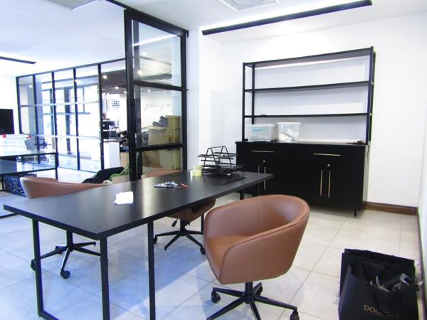 This contemporary 246sqm commercial space offers a modern and professional environment in Benmore Gardens, Sandton. Featuring sleek designs, high ceilings, and polished tiled flooring, the interior is bright and adaptable. Glass partitions create flexible divisions, allowing for open-plan layouts or segmented offices, complemented by contemporary lighting and striking accent walls.
