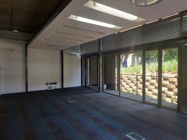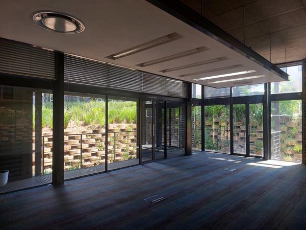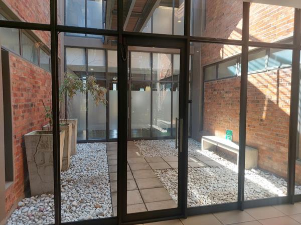 This beautifully fitted ground floor office suite in Bryanston features a semi-industrial aesthetic with exposed ceilings, screeded concrete floors, and glass partitioning. The space includes a small reception, a spacious boardroom with direct patio access, six private offices, an open-plan work area, a private meeting room, storeroom, and an exclusive kitchenette. Floor-to-ceiling windows and wrap-around balconies fill the space with natural light, offering incredible garden views that enhance the tranquil yet dynamic atmosphere.