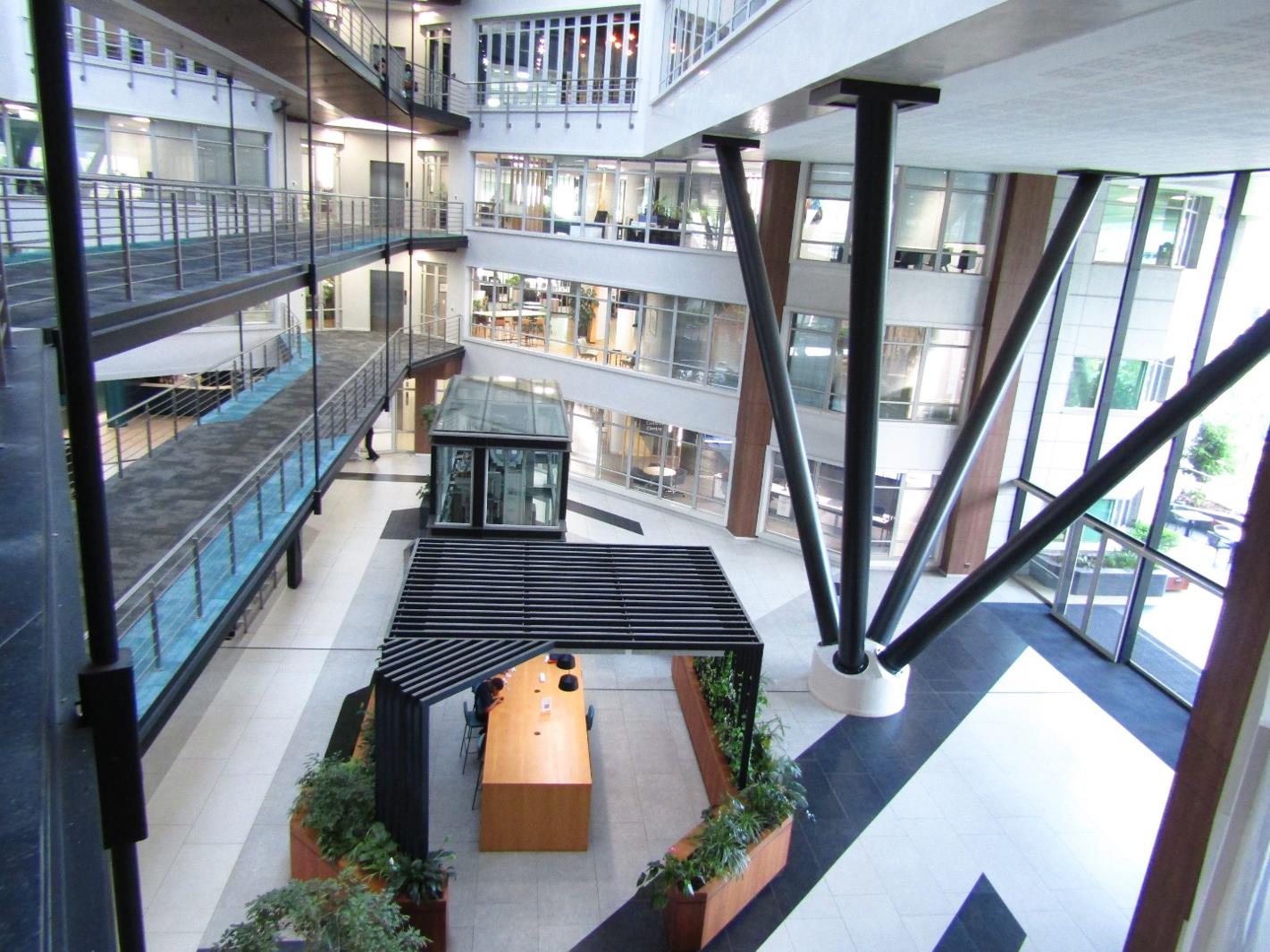 The property showcases a grand multi-level atrium flooded with natural light, featuring elevated walkways, stylish collaborative zones, and modern lobbies adorned with contemporary furnishings and lush greenery. Convenient escalator access ensures smooth circulation throughout the building, while the overall ambiance exudes professionalism and prestige.