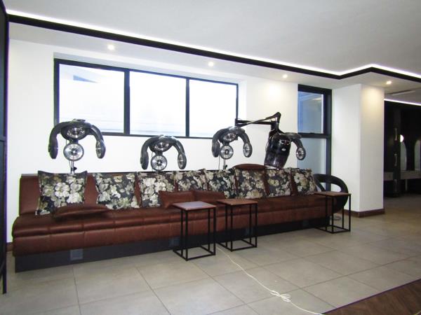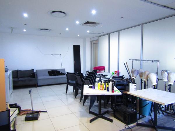 The interior boasts a modern aesthetic with high ceilings, durable tiled flooring, and sophisticated recessed and track lighting. The flexible layout can accommodate various business needs, from a professional office setup to a stylish salon or creative studio, as evidenced by the adaptable spaces seen within the building. Frosted glass partitions offer privacy while maintaining an open, contemporary feel, creating an inviting atmosphere for clients and employees alike.