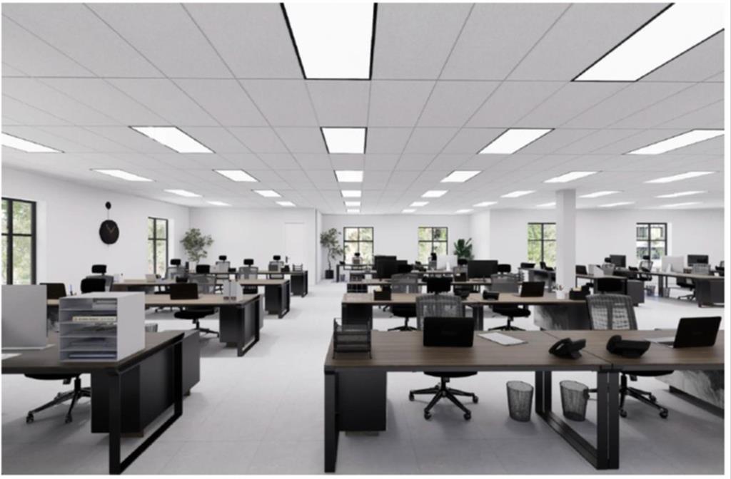 The interior showcases contemporary design elements, energy-efficient LED lighting, and a spacious open-plan layout complemented by multiple meeting and collaboration spaces. Large windows allow for an abundance of natural light, creating a bright and inviting workspace. A modern reception area, enhances the overall professional appeal of the premises.