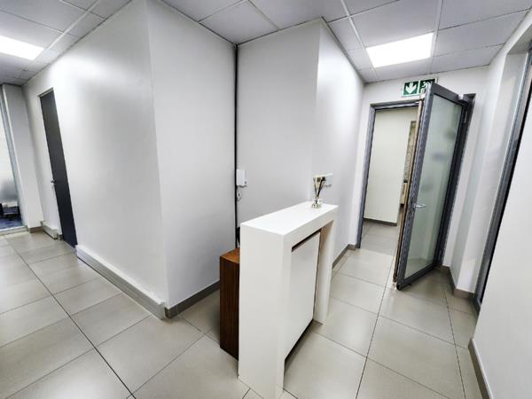 This office, located on the first floor, measures 191M2. It has a smart fitout in place, which includes a big open-plan area, a meeting room and a boardroom. Included in the rental amount are nine parking bays basement, covered and open. The building is equipped with a generator, municipal back-up water, as well as CCTV, air-conditioning, a lift and 24 hour security. Excellent signage opportunities onto New Road.