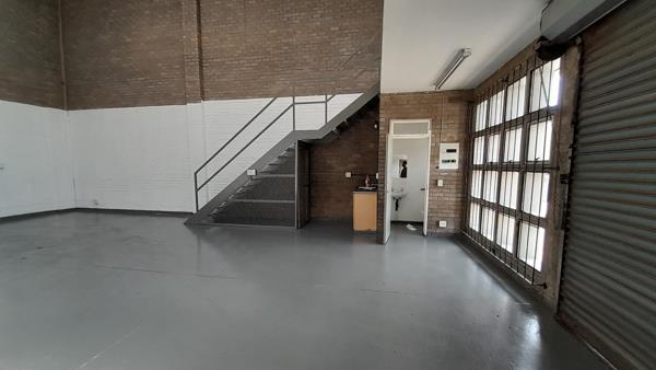 The unit comprises an open-plan warehouse with a 3m roller shutter door, 3-phase power, and screeded flooring. A small mezzanine level provides additional storage or office potential. The space also includes a kitchenette and one ablution facility, with good natural light enhancing the functional layout.