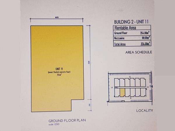 The unit comprises an expansive double volume warehouse component & a ground floor office component. The office component comprises a spacious reception area, 1 office &. The warehouse component is totally open with no partitions & with a mono sloping roof. There is a kitchenette plus an ablution area with 2 single toilets(1 ladies & 1 gents) situated right behind the office section. The roof is 8m high at the high end & 4,5m high on the lower end which is the rear of the unit. The warehouse has 3 phase electricity, 63A power, 1 large on-grade roller shutter door (3,9m high & 3,52 m wide), good natural lighting from skylights & large rear windows, plus a rear emergency exit opening into a common atrium courtyard. The unit has 6 reserved open parking bays in front of the office section & a communal wrap around driveway space which allows interlink trucks to access each unit.