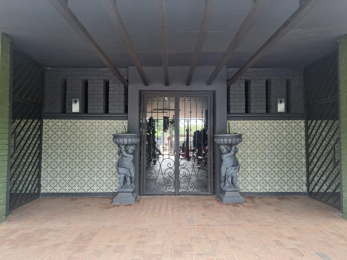 The property includes two well-appointed bathrooms and a practical utility area with a sink and dedicated workstation. A communal kitchenbreak area provides essential amenities for staff convenience. The secure environment is enhanced by ornate wrought-iron gates at the entrance and a metal security gate within, ensuring peace of mind for tenants and visitors.