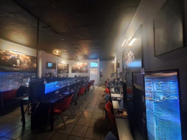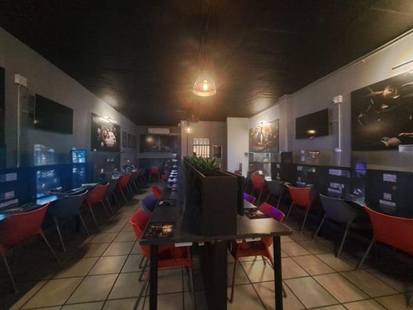 This 65sqm commercial unit, situated within a secure complex in Rietfontein, Pretoria, offers a highly adaptable space ideal for various business operations. Currently configured as a functional internet cafe or gaming lounge, the layout features multiple individual workstations with privacy screens, thematic wall art, and durable tiled flooring throughout. Air conditioning ensures a comfortable environment for clients and staff, while the overall design supports a focused work or entertainment setting.