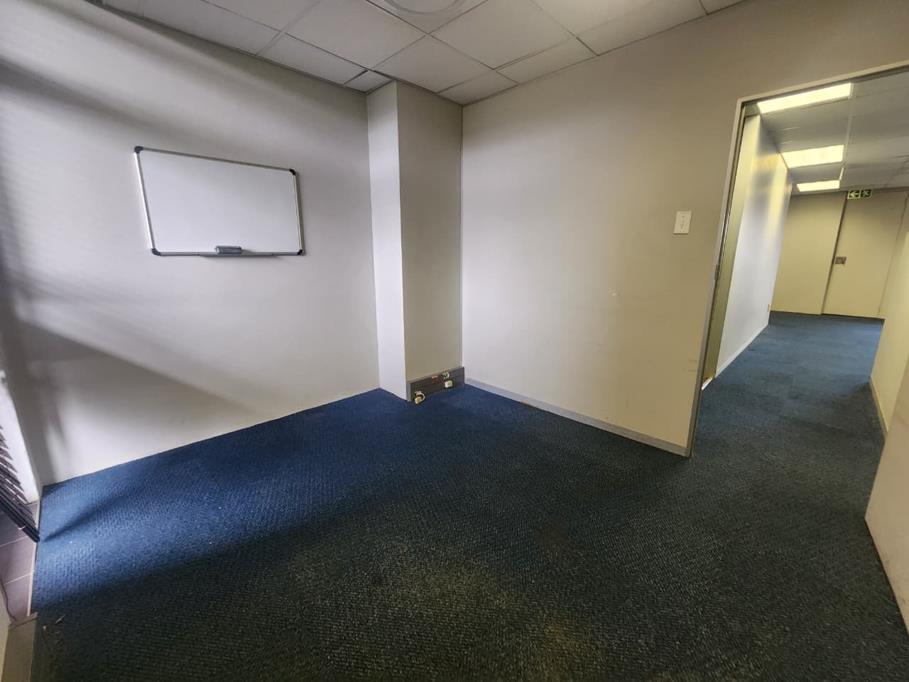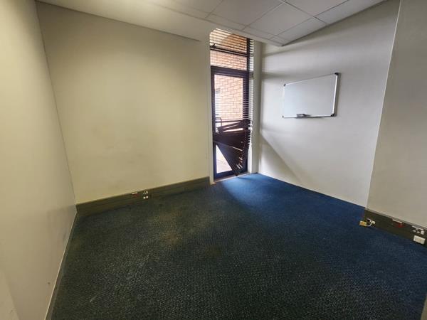 The office features a professional layout with a welcoming reception area, four glass-partitioned closed offices, four open-plan work areas, and access to communal kitchen and ablution facilities. It is equipped with air-conditioning, fibre connectivity, carpeted flooring, ample natural light through window blinds, and reliable back-up power to ensure uninterrupted operations during load shedding. Positioned next to the elevators within the multi-tenanted centre, the unit ensures easy accessibility for visitors and employees.