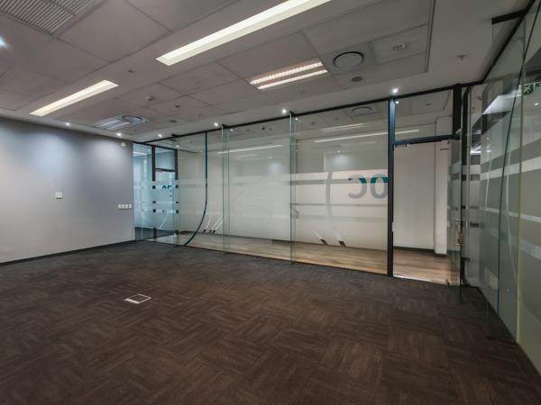 This spacious P-grade office has been segmented into a reception area, a open plan office area, boardroom and a balcony overlooking the park. It showcases modern fixtures and fittings such as neat carpet flooring with laminated flooring, and large windows with blinds allowing for an ample amount of natural light to filter into the offices. Additionally, it has been equipped with central air conditioning and fibre optic cable for quick internet connectivity. Mercedes-Benz Place building features a beautiful atrium, creating a serene corporate environment. The landlord is willing to offer a free beneficial occupation period, subject to the terms of the lease agreement. The unit is soundproof pocket, and a professional environment.