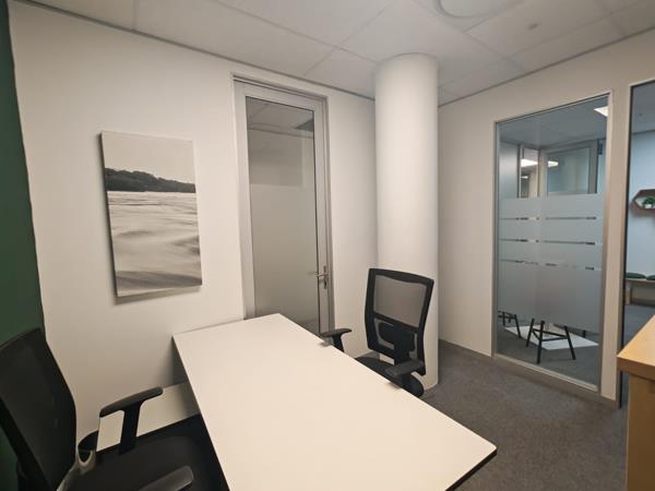 This 23m2 AAA-grade office suite presents a compact yet stylish workspace featuring neat carpet flooring, air-conditioning, window blinds, fibre connectivity, and ample artificial lighting. The layout includes a private closed office with a small open-plan workstation, offering flexibility and comfort for a professional setup.