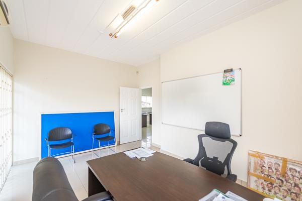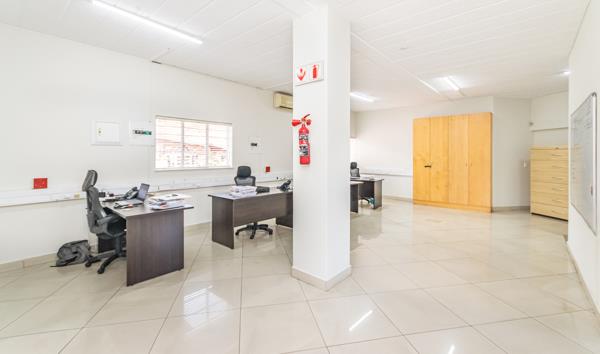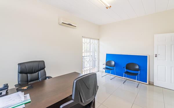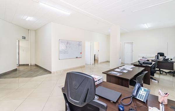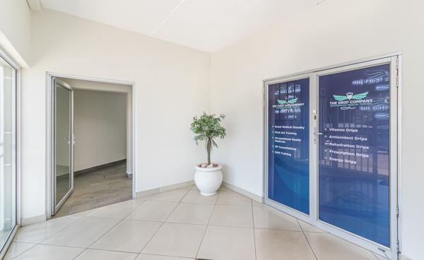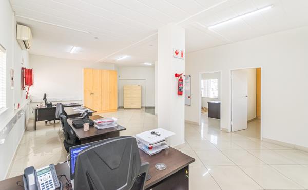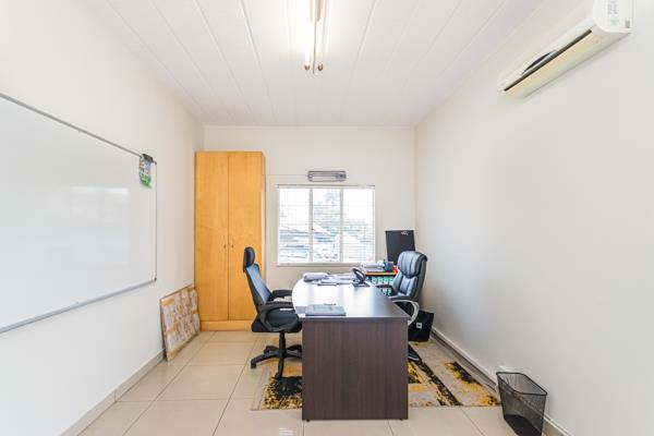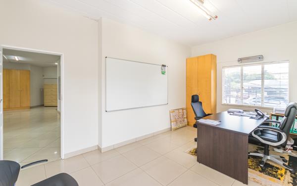 Ground- floor office with direct main entrance access and a display area at the entrance, ideal for client-facing businesses. The space offers a large open-plan area for 4 staff, two large and one medium private offices one with a balcony, and a spacious, well-fitted private kitchen. Suitable for up to 7 people. Located in a secure professional office park with 247 manned security, AI-monitored cameras, access control, ample parking, multiple fibre providers, modern bathrooms, and access to a communal boardroom.