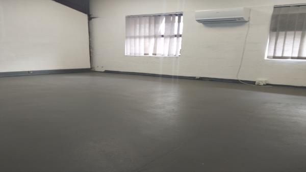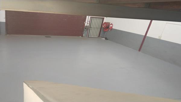 Warehouse floor: 65m2 of practical open workspace, coated with a durable two-part epoxy grey.