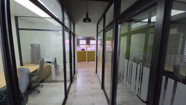 The space features modern glass partitioning with sleek aluminum frames, creating a bright, open, and professional environment.