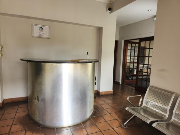 Wooden doors leads into the offices private reception area, which is fitted with air conditioning and windows offering natural light and an inviting atmosphere.