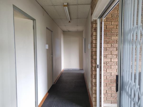 This neat and sunny 100 sqm office offers excellent visibility and easy access from the main road. The premises feature a sliding door entrance leading into a spacious open-plan reception area that can comfortably accommodate up to four desks. It also includes two large private offices and ablutions.