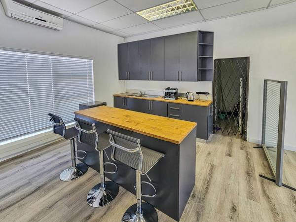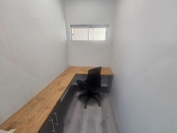 This office station, with access to a communal kitchen as well as a conference area, can be rented on a daily or hourly basis. The station has a lock-up door and the rent will include the use of the conference facility for one day a month. The rental amount for the station includes a built-in table and chair, the cost of electricity and wifi. A communal kitchen is available. Your dedicated parking area is available at an additional cost. The office has solar and you will therefore not be affected by load shedding.