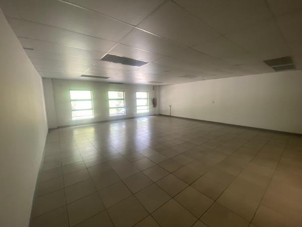 Large windows provide excellent natural light throughout the space, creating an open and inviting working atmosphere. The interior features white tiled flooring, enhancing the offices contemporary appearance while ensuring ease of maintenance. The open-plan layout allows tenants the flexibility to configure the space to suit their operational needs, whether for collaborative workstations, private offices, or meeting areas.