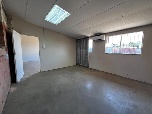 Security is enhanced with security bars on windows and robust security gates, providing peace of mind. The property benefits from one dedicated parking bay and direct access to an unpaved outdoor yard area, offering additional storage or operational space. This secure and accessible location supports efficient business logistics.